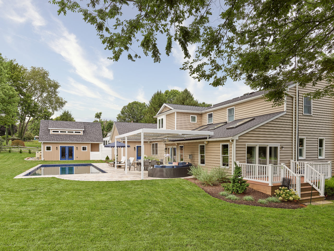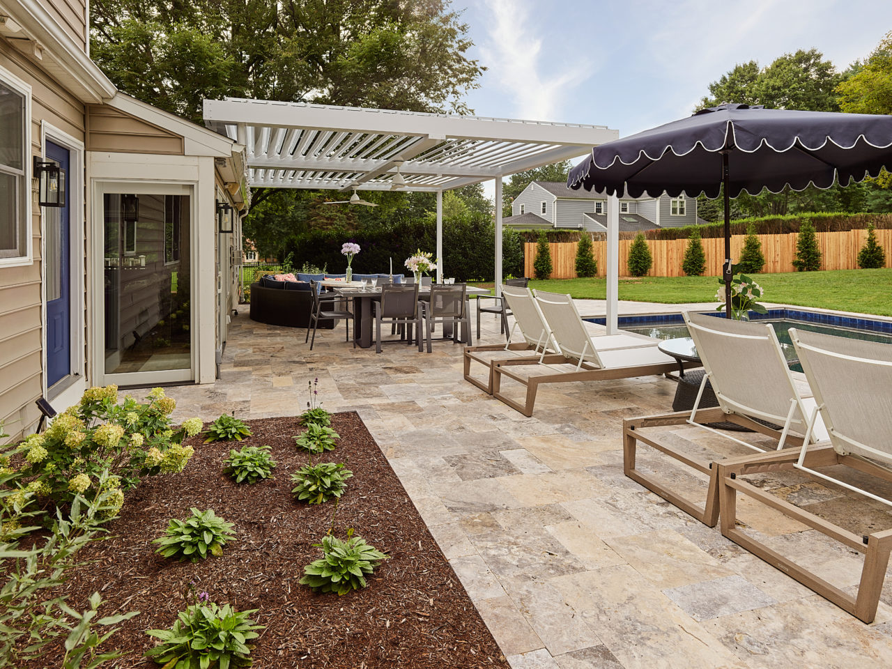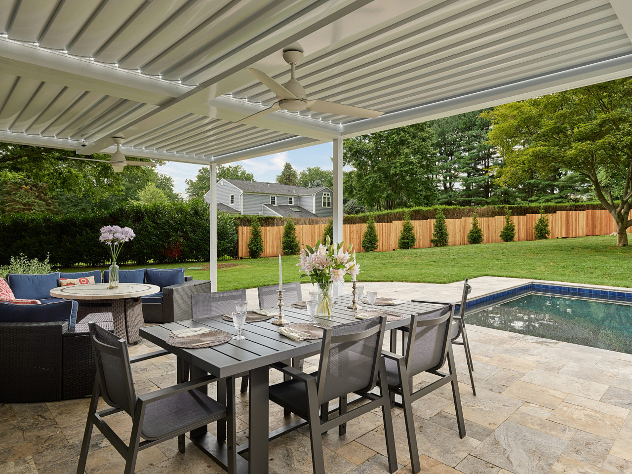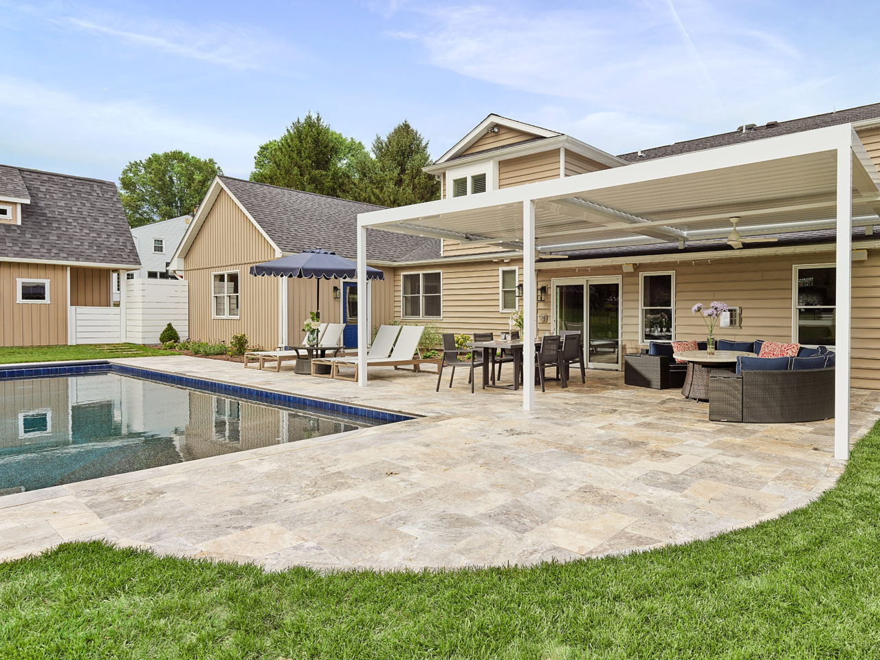 Circular Techo Bloc Driveway, Custom Pool, Patio & Motorized Pergola